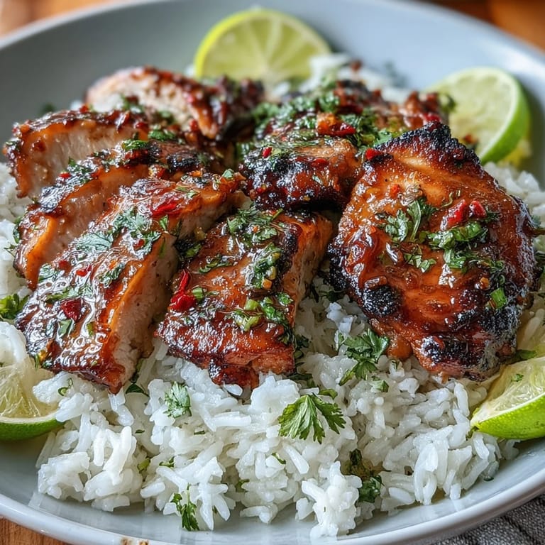- Fluff coconut rice with a fork. Serve chicken atop rice, garnished with chopped cilantro and lime wedges.