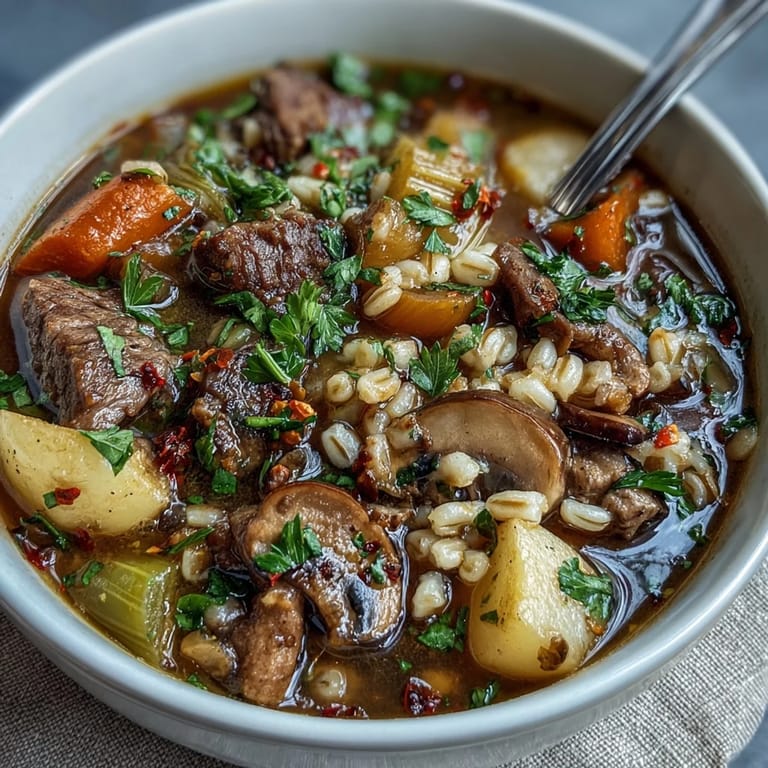 Save The smell of this soup simmering takes me back to a tiny apartment with drafty windows and a creaky radiator that never quite caught up with winter. My roommate had brought home a bag of pearl barley on a whim, and we spent a Sunday afternoon experimenting with whatever we had in the fridge. That first batch was too thick, slightly underseasoned, but something about the combination of earthy mushrooms and tender beef just worked. We ate it standing up in the kitchen, burning our tongues because we couldnt wait another second. Now its the soup I make when I need to feel held by something warm and steady.