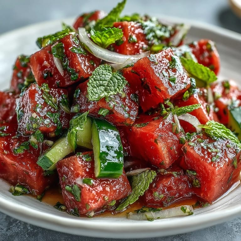 I made this for a backyard gathering last July, and watching people's faces light up when they took that first bite reminded me why simple food matters. Someone asked what was in it, expecting some complicated technique, and I could barely explain—watermelon, cucumber, mint, lime. The simplicity was almost disappointing to them until they tasted how the flavors danced together. My friend Sarah came back for seconds and asked if I'd used some fancy ingredient she couldn't identify; I hadn't, which somehow made her even more determined to recreate it at home.